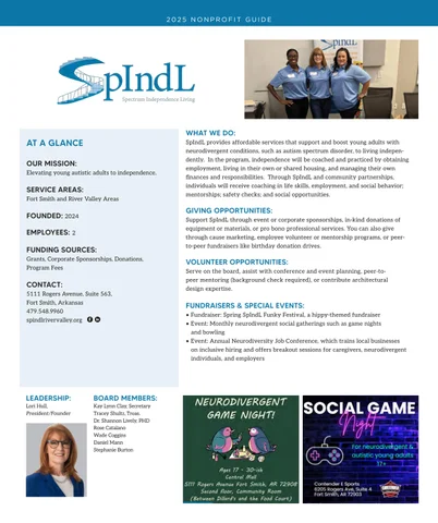 SpIndL provides affordable services that support and boost young adults with neurodivergent conditions, such as autism spectrum disorder, to living independently. In the program, independence will be coached and practiced by obtaining employment, living in their own or shared housing, and managing their own finances and responsibilities. Through SpIndL and community partnerships, individuals will receive coaching in life skills, employment, and social behavior; mentorships; safety checks; and social opportunities.